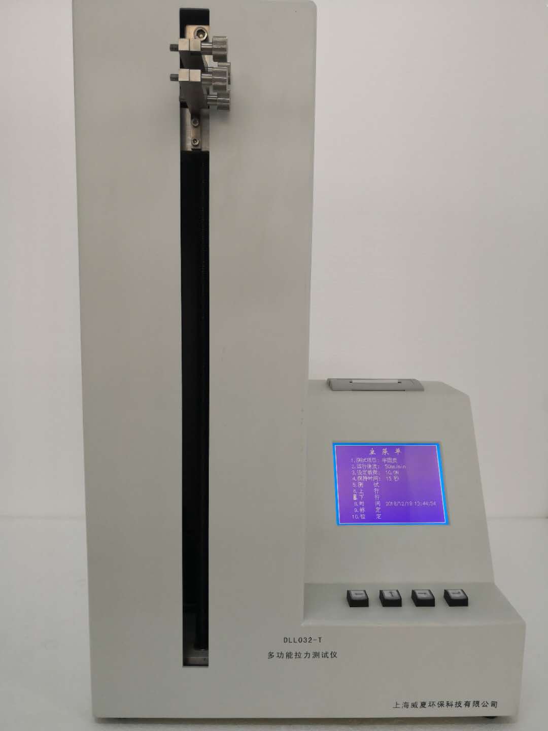 采用PLC可編程控制器,5.7英寸彩色液晶顯示屏,中文菜單顯示、力值傳感器、測力機構、傳動機構、機載打印機等組成。中文菜單顯示,人機對話設定各項參數自動運行測試;實時顯示拉力的最大值、平均值,自動判別合格與否,并由打印機打印出測試數據。儀器終身免費升級。