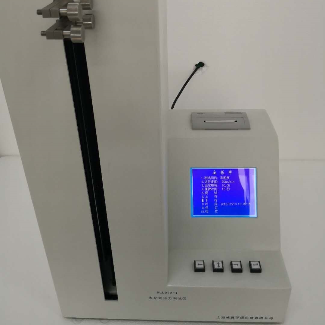 采用PLC可編程控制器,5.7英寸彩色液晶顯示屏,中文菜單顯示、力值傳感器、測力機(jī)構(gòu)、傳動(dòng)機(jī)構(gòu)、機(jī)載打印機(jī)等組成。中文菜單顯示,人機(jī)對(duì)話設(shè)定各項(xiàng)參數(shù)自動(dòng)運(yùn)行測試;實(shí)時(shí)顯示拉力的最大值、平均值,自動(dòng)判別合格與否,并由打印機(jī)打印出測試數(shù)據(jù)。儀器終身免費(fèi)升級(jí)。